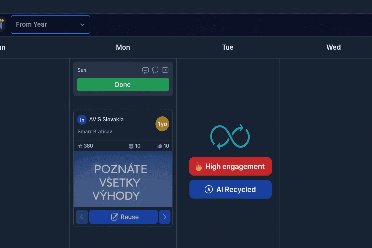Recycle Top-Performing Content with AI Leverage our custom AI (powered by the latest ChatGPT) to create posts, recycle top content, and automate replies—smarter, faster, better.